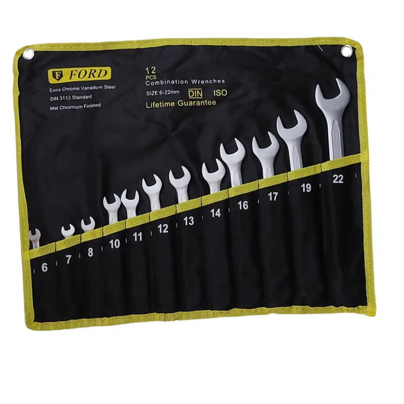 آچار یک سر رینگ-یک سر تخت فورد مدل 6-22 دارای 12 عدد به سایزهای 6،7،8،10،11،12،13،14،16،17،19،22 می باشد.ساخته شده از متریال کروم وانادیوم است که آبکاری کروم که مانع از لغزش ابزار حین کار می شود